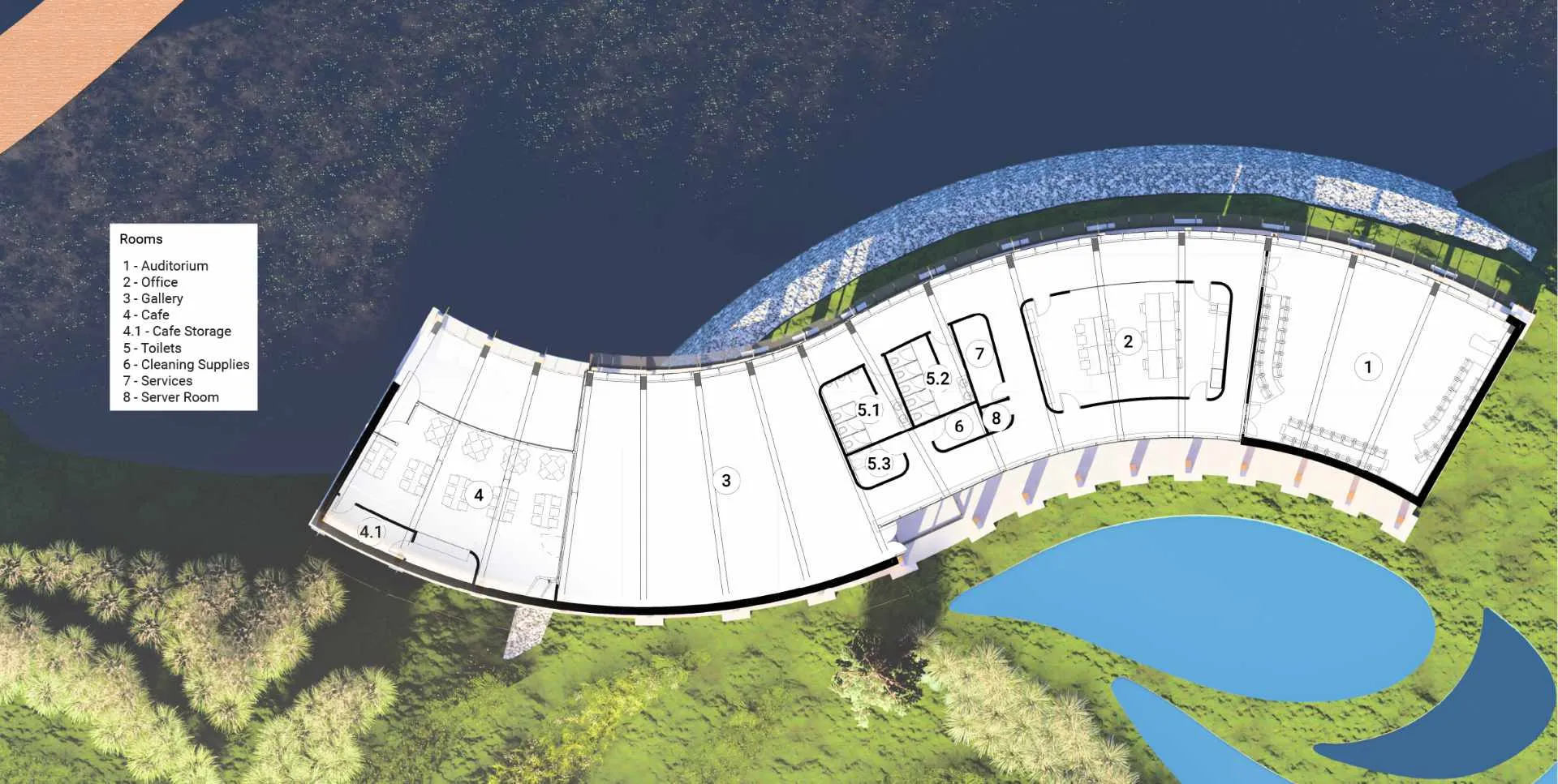 As climate change becomes more of a challenge in architecture, future project should focus on how buildings adapt to changing environmental conditions. With flooding being the focus of this site (Lake Windermere), my proposal focused on how flooding can be mitigated using the built environment. The final site features water retention pools that aid in reducing water runoff and slow its progress towards that river. A wetland was also places in the river to help boost biodiversity and further reduce the speed water flows downstream in flooding conditions. The main building itself features a café, gallery and auditorium for educational and research purposes.
