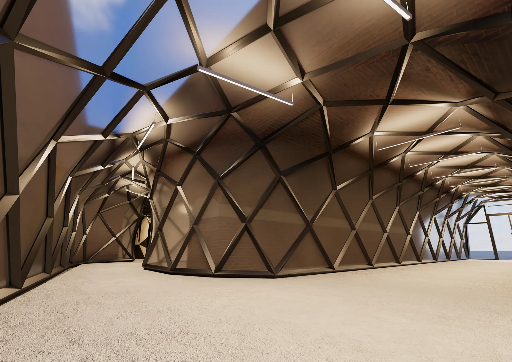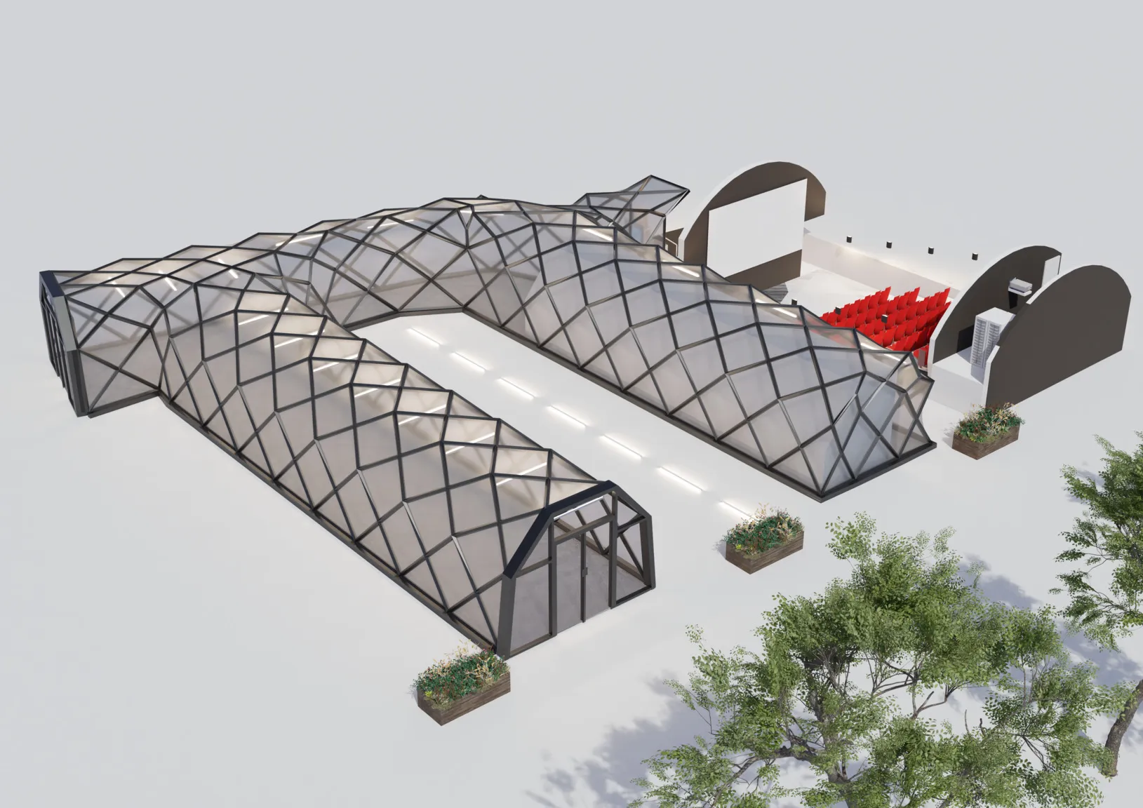 The opportunity to reimagine unique spaces often provides the most unique forms of architecture. Parasitic architecture was the main focus for this project, which centres around a cinema housed inside a previously disused viaduct. ETFE is used as the main covering for the circulation space and service areas; its flexible construction allows a continuous structure to flow through and around the viaduct. Additionally, it allows ample natural light and a constant connection to the surrounding area. The cinema itself can seat 58 and has disabled access via the elevator. The base level is 1.4 metres below street level to allow for more seating, and allow the back rows to be a comfortable distance from the ceiling.